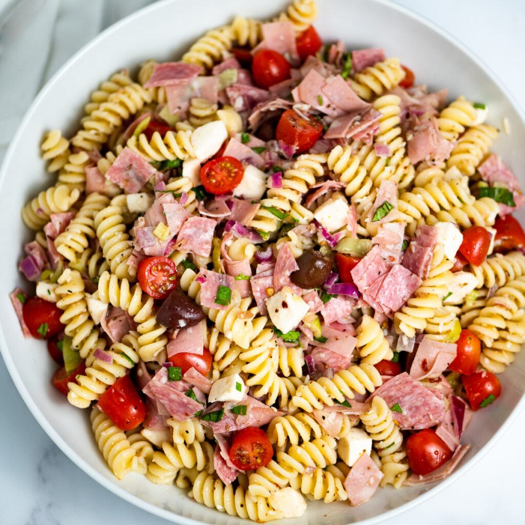 Before serving, give the salad a quick stir. Top with fresh herbs like parsley or basil if you like. That’s it—your Italian Antipasto Pasta Salad is ready!