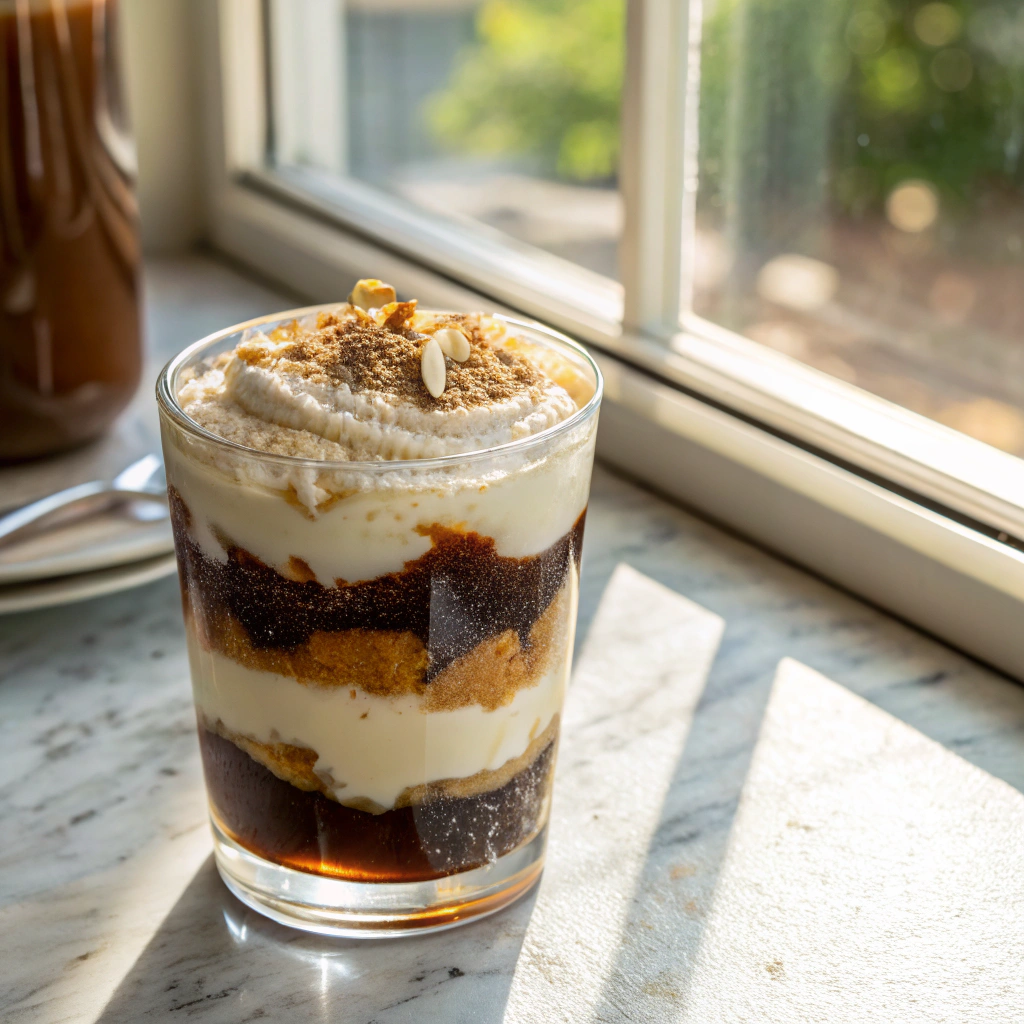 3. Gently spoon the tiramisu cream on top. Don’t mix it right away—it looks fancy with the cream floating!
