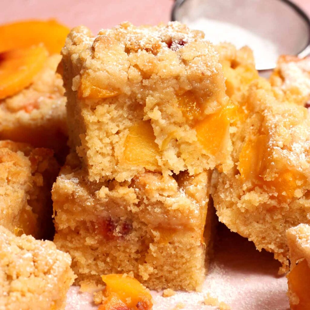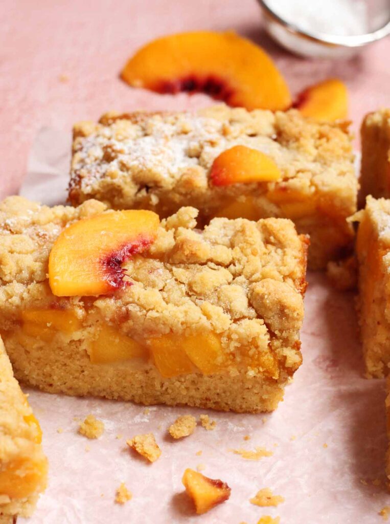 - Sprinkle this crumb topping all over the peach layer.