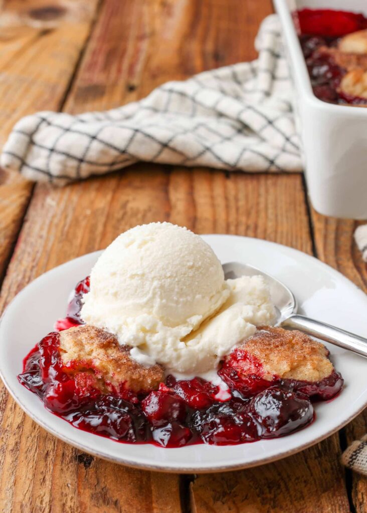 Scoop the cherry cobbler into bowls and, if you like, add a spoonful of vanilla ice cream or whipped cream on top. Enjoy!
