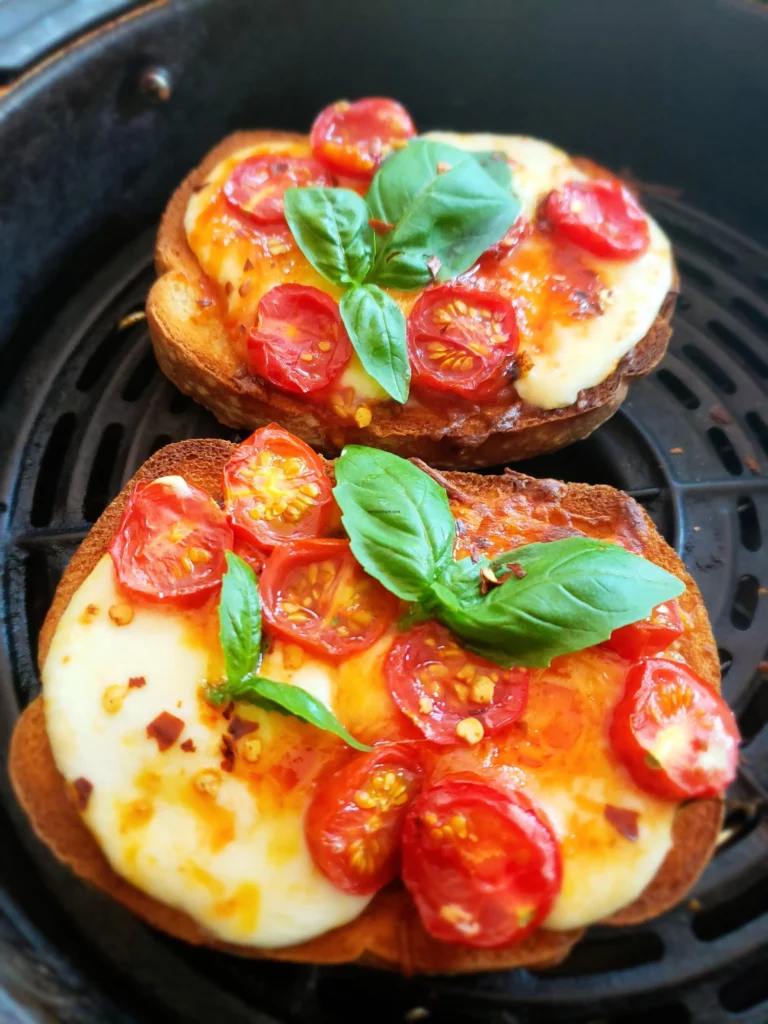 Place the prepared bread slices in the air fryer basket in a single layer. Don’t overlap them. Cook at 360°F for 6 to 8 minutes. Check halfway through to see if the cheese is melted and the bread is golden brown.