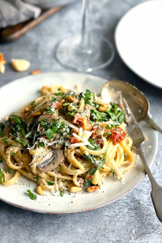 - Add the cooked pasta to the pan with the creamy spinach mushroom sauce.