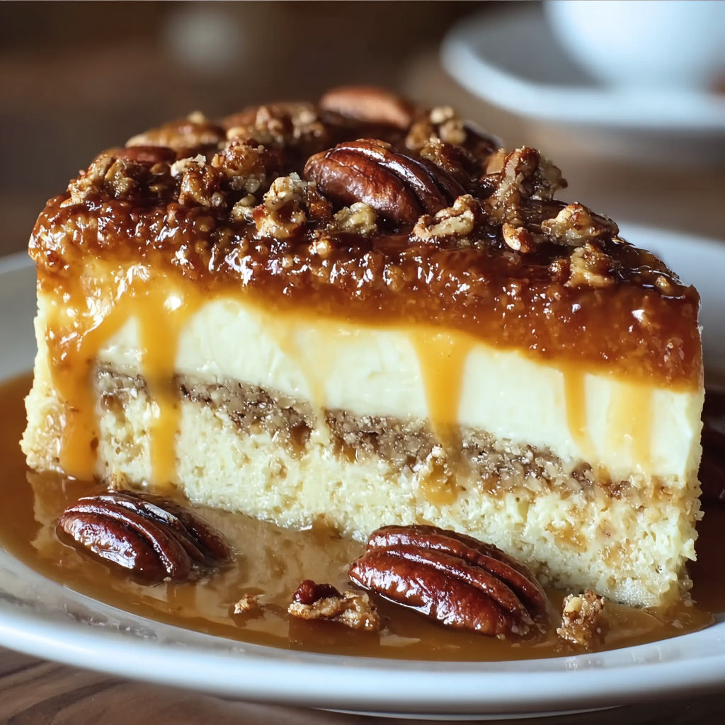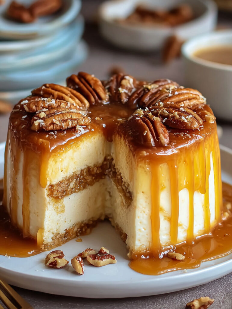 - Serve warm or chilled. Every bite will have a soft cake, creamy custard, and crunchy caramel pecans.